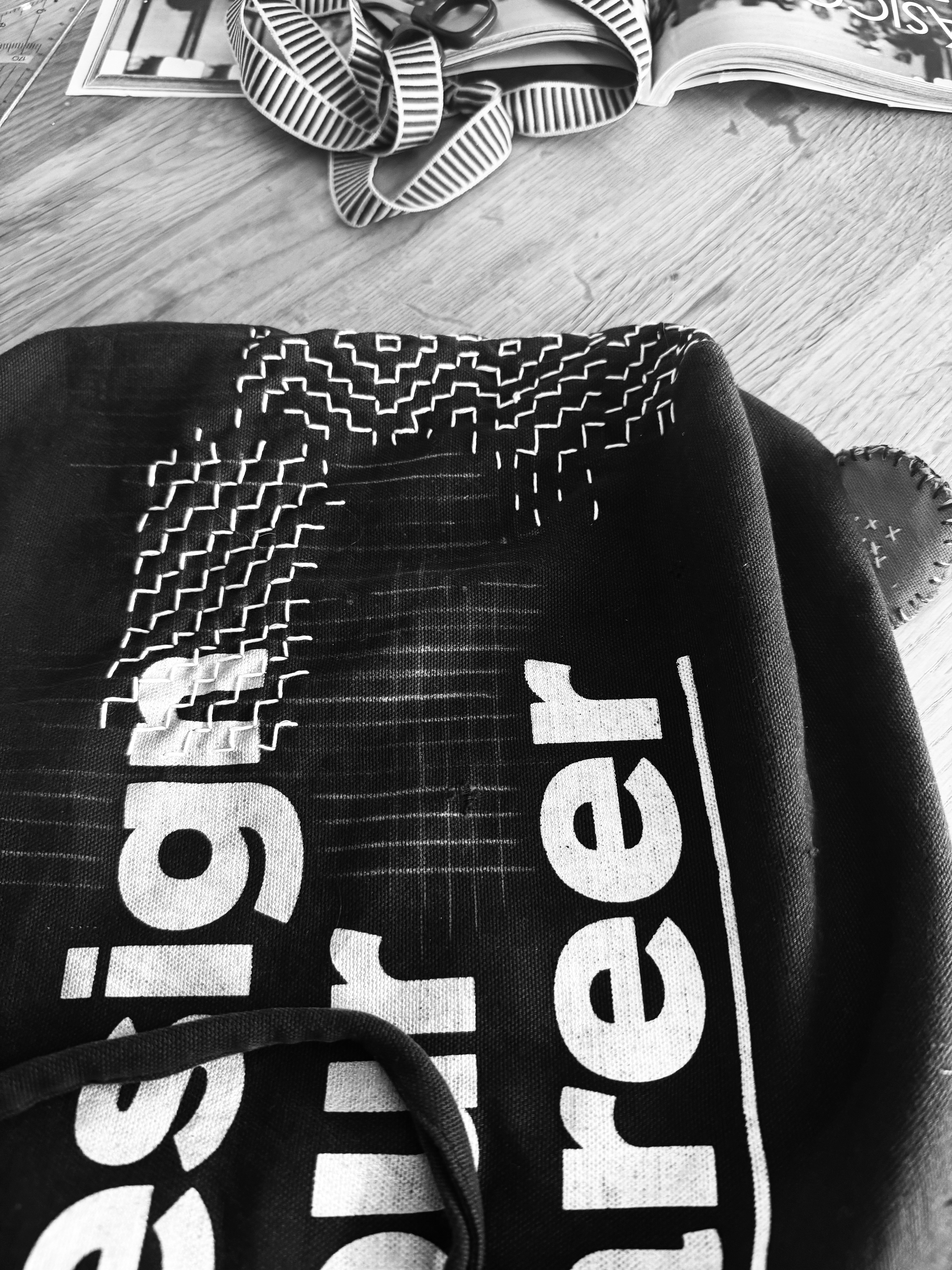 Sashiko is a Japanese technique to repair fabric. It also makes it stronger and so the object can hold for longer. I repaired with this technique one of my favourite fabric bags, the one I got in Shillington when I learned graphic design.